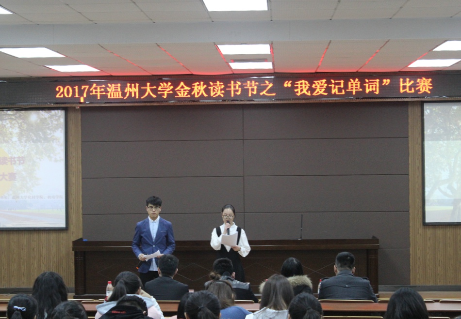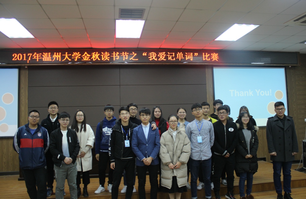 2017年11月24日下午18:30,黄色网址 团委学生会学检部和化学与材料工程学院团委学生会文体部在化学与材料工程学院11C401联合举办了温州大学金秋读书节之“我爱记单词”大赛。出席本次活动的有机电学院团委学生会主席曹瑞涵,副主席周梦莎,化材学院团委学生会主席章林祥,团委副书记刘晓霞,副主席冯志浩及来自温州大学的14支优秀队伍。