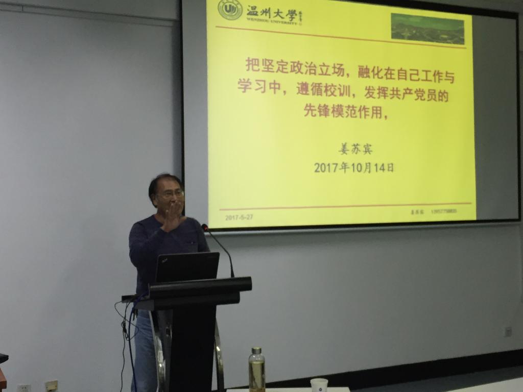 学院退休老领导姜苏宾老师为全体党员和入党积极分子作了《把坚定政治立场融化在自己工作与学习中,遵循校训,发挥党员的先锋模范作用》的报告,姜苏宾老师通过叙说学院的建立初期的艰苦过程,将“不忘初心”的含义讲解得淋漓尽致,告诫研究生党员要增强党员意识,并提出要提高学习能力、加强党性修养、继续学习党章的三项要求,做一个合格党员。