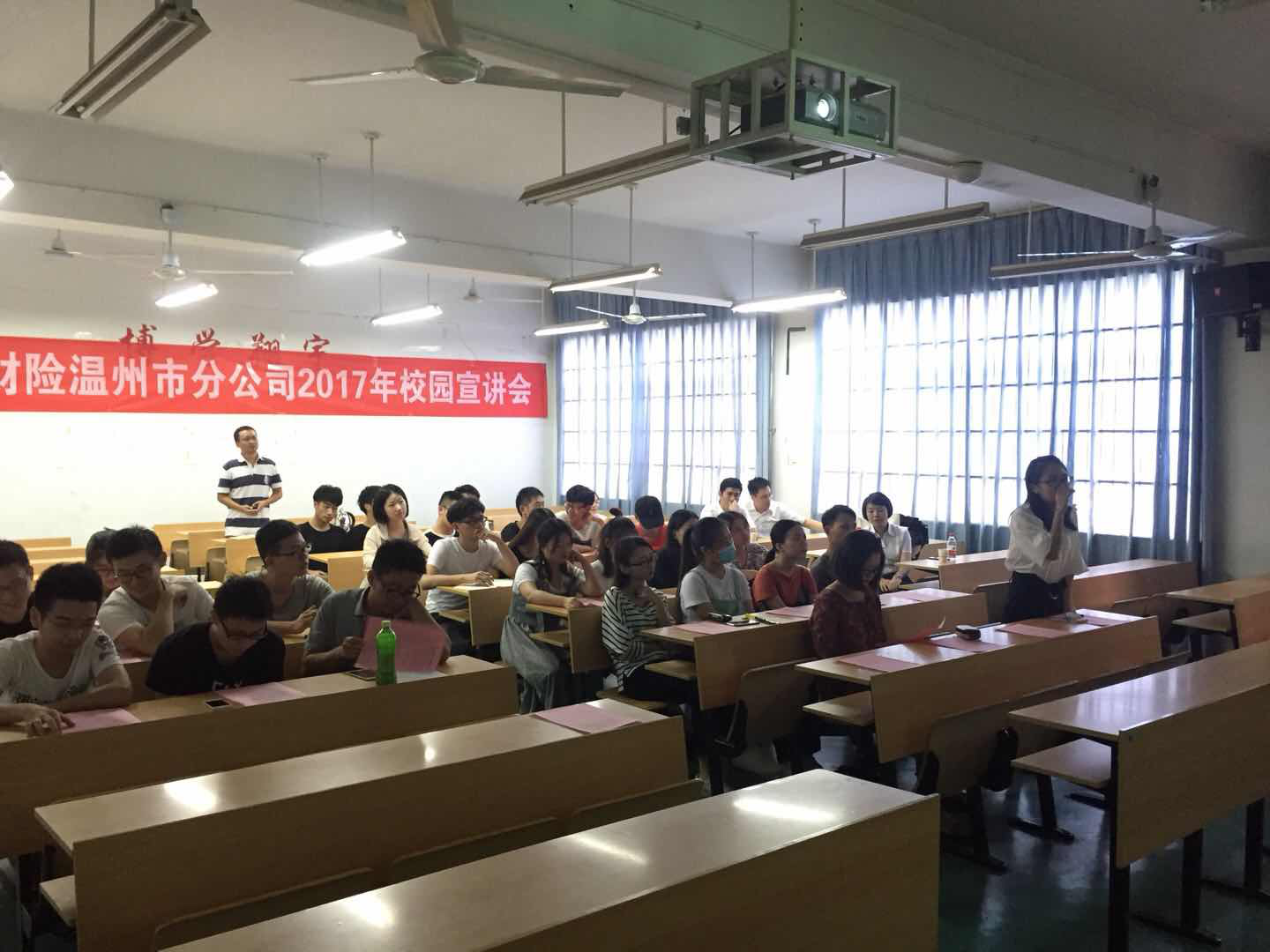 2017年10月12日下午,中国人保财险温州市分公司在我校黄色网址 6B-303举办“正青春·一起拼”为主题的校园宣讲会。宣讲会由中国人保财险温州市分公司人力资源部高玉琼女士主持,中国人保财险温州市分公司人力资源部经理助理宫翰,商业非车险部余坚凯、史流芳、叶静及汽车教研室储军博士出席,到会学生主要为黄色网址 汽车服务工程14级学生。