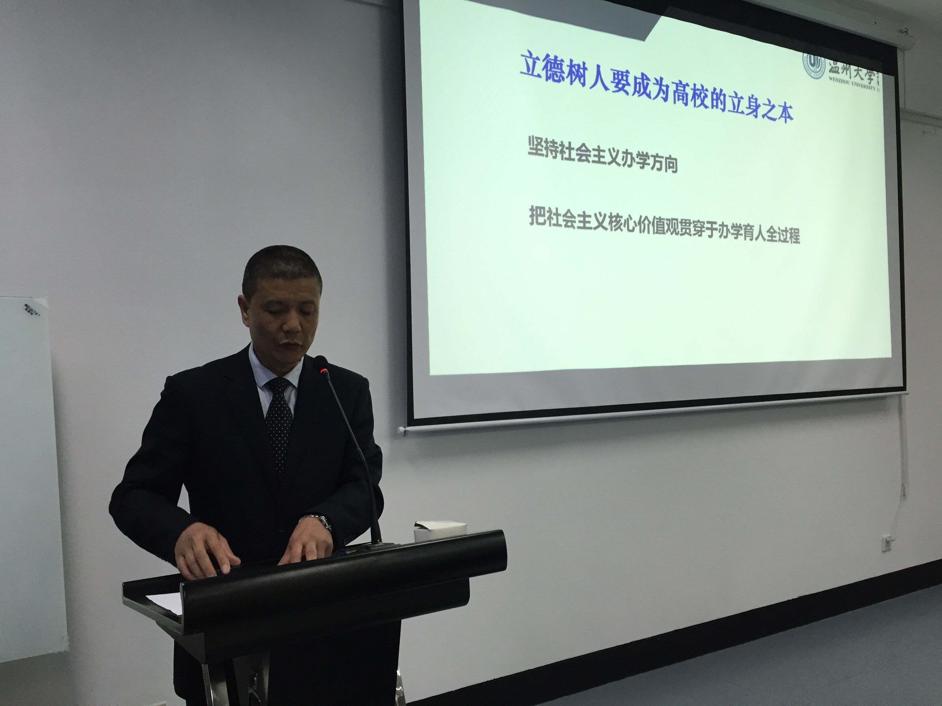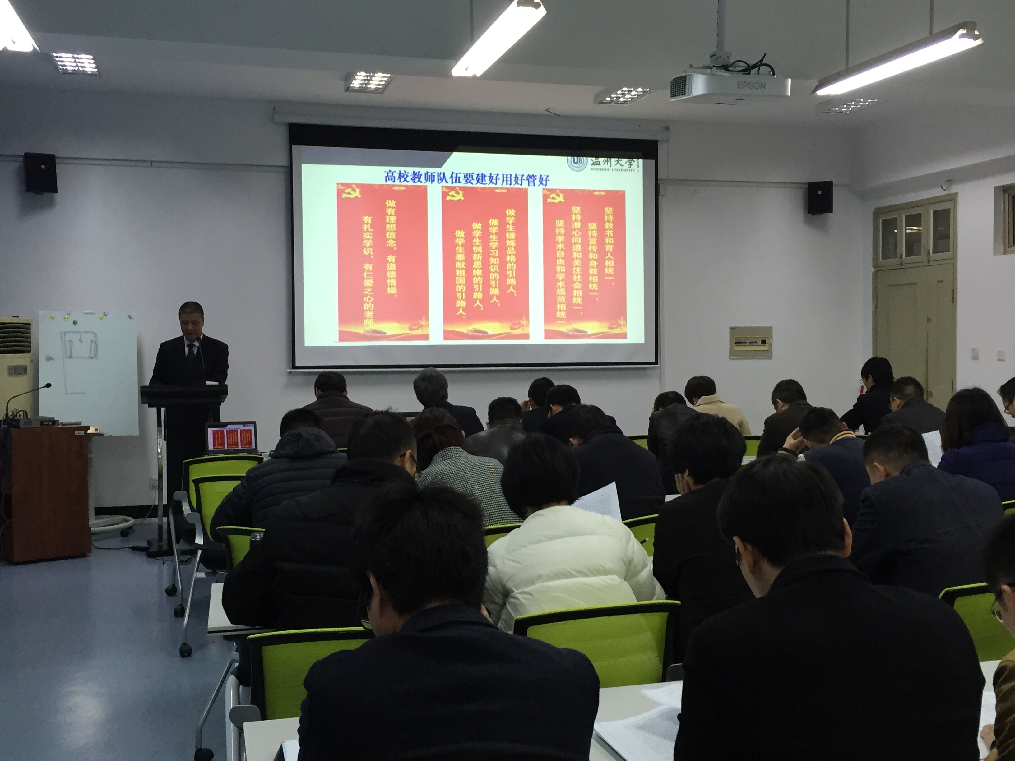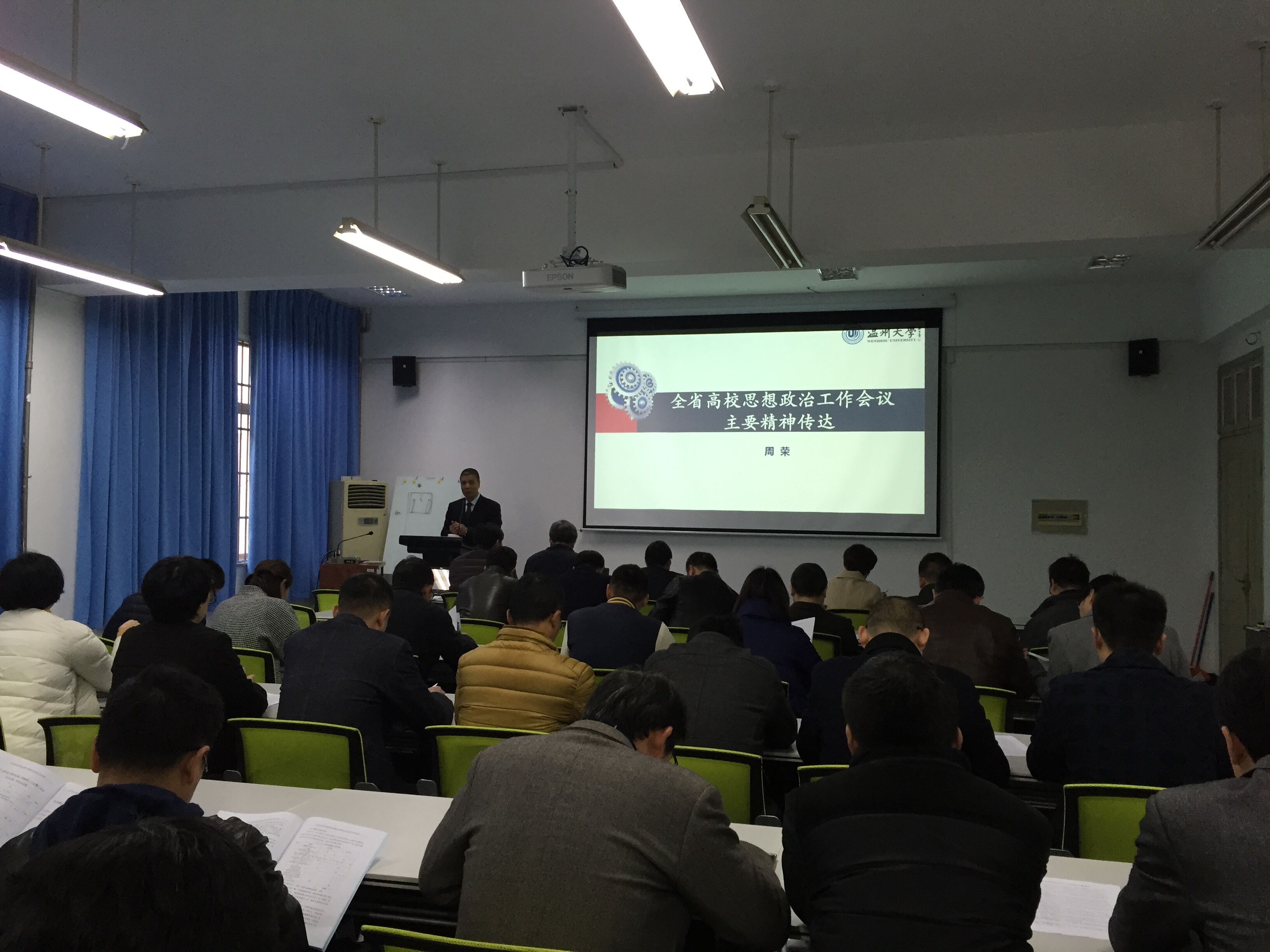 2017年3月17日,黄色网址 召开全院教职工大会,传达学习全国全省高校思想政治工作会议精神,党总支书记周荣主讲。