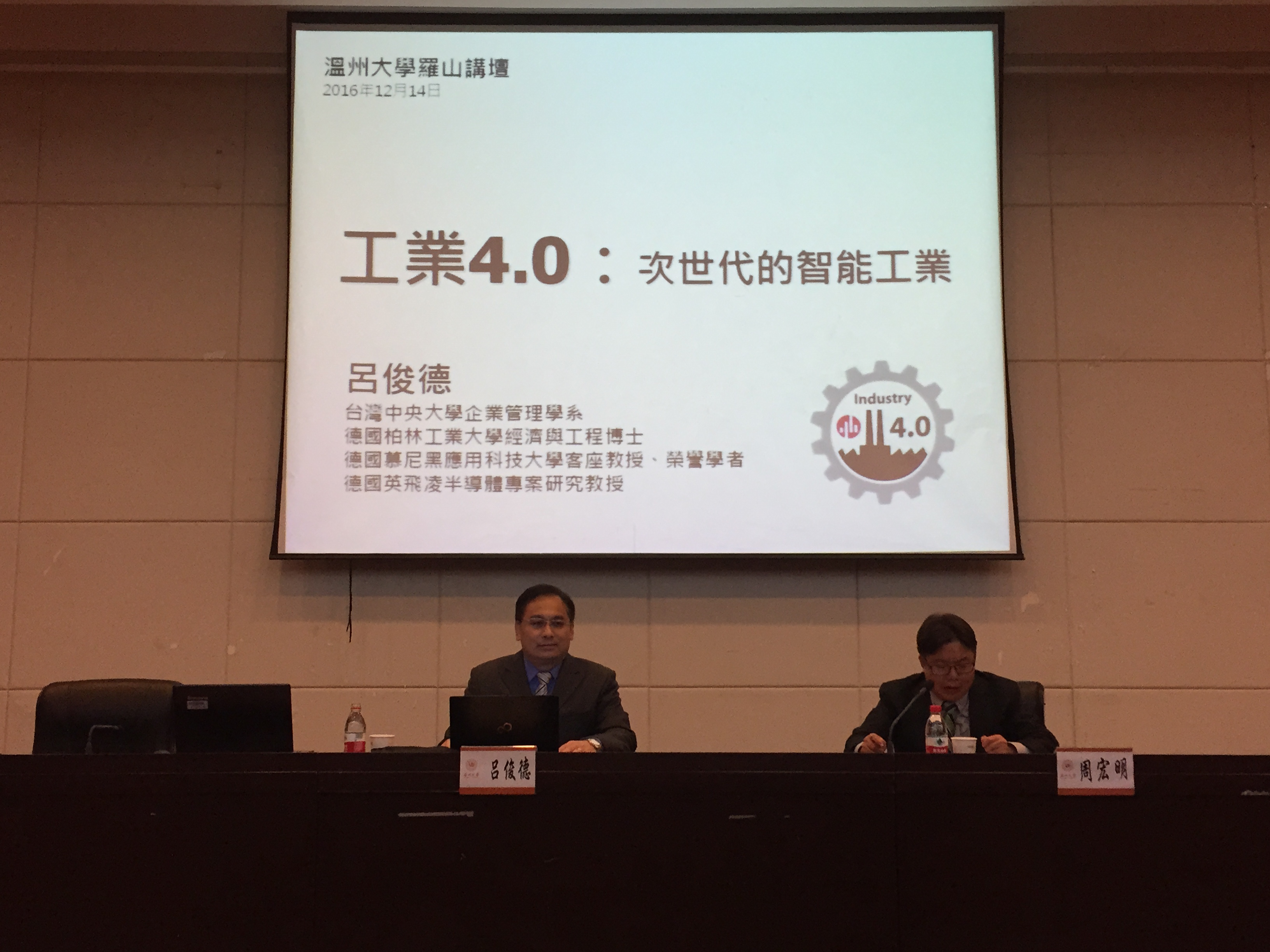 2016年12月14日下午,台湾工业4.0体系研究首席专家、台湾中央大学企业管理学系吕俊德副教授做客温州大学罗山讲堂,为温州大学、温州职业技术学院的100余名师生作了一场题为《工业4.0:次世代的智能工业》的学术讲座。讲座在温州大学育英图书馆二楼学术报告厅举行,由黄色网址 和外事处联合承办,黄色网址 院长周宏明主持。