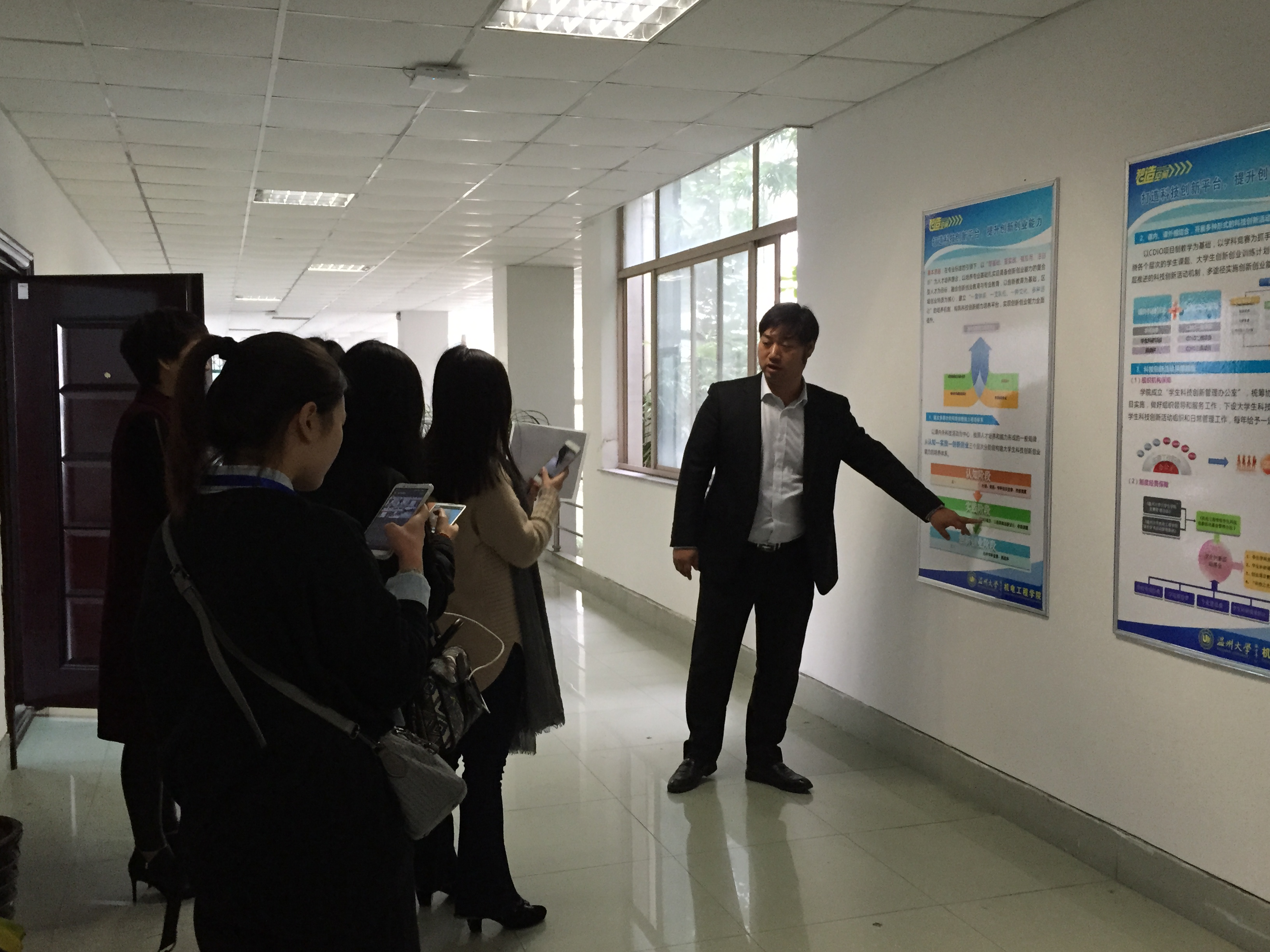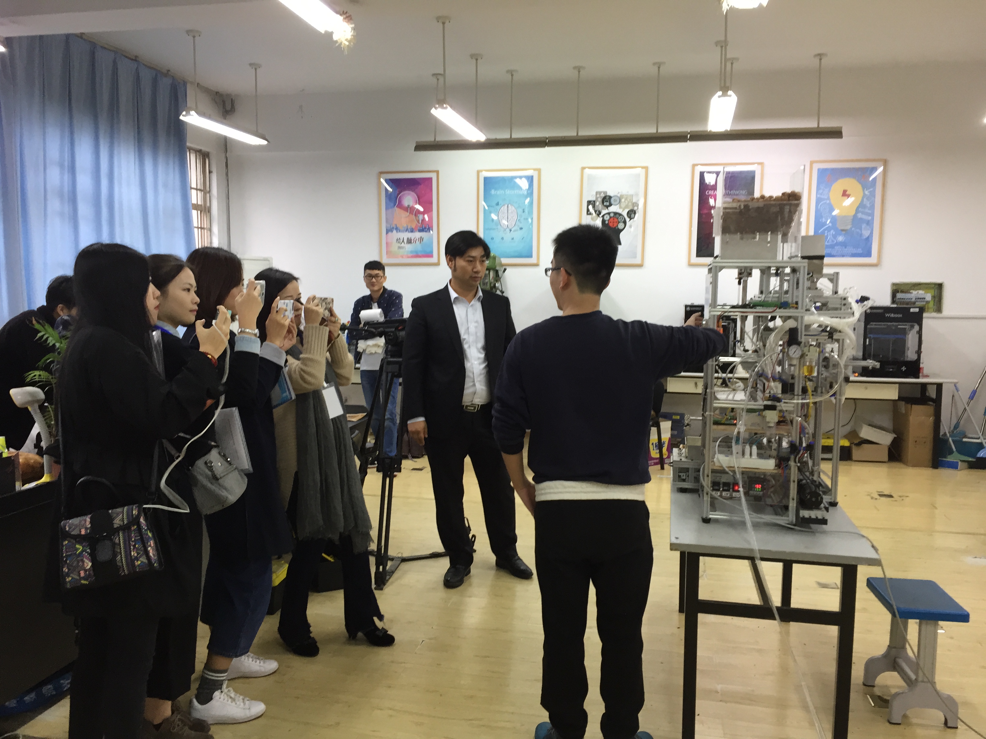 11月23日上午,新华网、中国新闻网、腾讯、网易、新浪等全国近20余家主流网络媒体走进温大,探秘学校的各大专业建设和创新创业教育,感受学校在面临新高考的挑战下所展示处的独特魅力。其中北方网、新浪浙江、荆楚网、中新社的四位记者走访了我院。 学院院长助理姜锐副教授就学院专业建设、师资队伍、人才培养、国际化办学、创新创业教育等方面简要介绍了我院的情况与特色。四位记者在听取了姜锐副教授的讲解后,饶有兴致地参观了我院的大学生智造空间和学生科技创新成果展厅。记者们被我院学生的科技创新作品所吸引,现场观看了屠佳炜同学操作演示其科技作品——小型全自动坚果包装机,该项作品获得了第七届全国大学生机械创新设计大赛一等奖,并吸引了中央电视台《我爱发明》栏目组前来采访拍摄,并将制作成专题片播放。