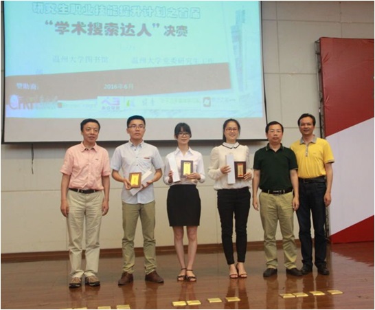 为了使广大读者深入了解和使用图书馆的各类学术资源,提高我校研究生科研素养,图书馆与研究生部联合举办了温州大学首届“学术搜索达人”大赛。大赛决赛于6月1日下午14:00在育英图书馆二楼学术报告厅顺利举行。温州大学党委委员研究生部部长陈安金、图书馆馆长李益明、研究生部副部长董新姣出席了本次活动。本次大赛邀请了机电学院向家伟教授、创业学院王佑镁教授、物电学院李士本教授、图书馆王希与马宏伟老师担任决赛评委。此外,近200名研究生、本科生全程观摩了比赛。