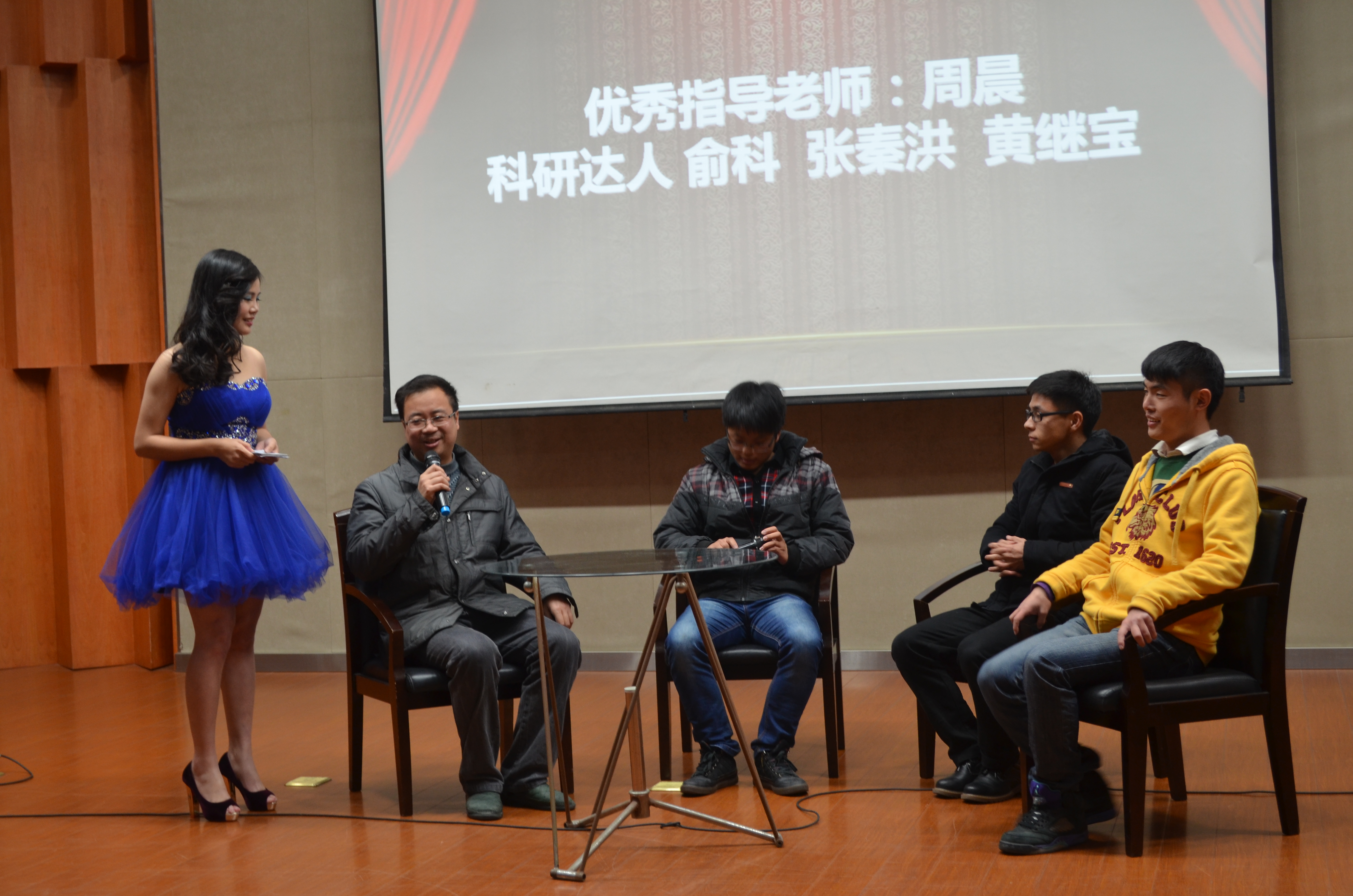 随后,科技成果表彰及颁奖仪式开始。机电学院第六届“科技之光”活动月较往年又有了新的突破,八个比赛项目累计报名参与人数达到1000余人次,大大提高了学生参与面。“科技之光”活动月一个个子活动的颁奖仪式把本次活动的氛围推向高潮,首届自行车功能和结构创新大赛、机械加工大赛、机械制图大赛、优化设计大赛等,踊跃参与“科技之光”系列竞赛活动并获奖的同学们纷纷站上领奖台,展现出机电学院学生勇于创新、勤于实践的风采。然后钱金贵与周轶婷两位科技之星代表给大家分享了他们的科研经历,让我们明白科技创新的每一个成就背后都充满了艰辛和曲折,克服一个个困难的过程才能体现我们出不断发现问题并解决问题的能力。除了科技之光活动月的各类竞赛,今年机电学院在挑战杯、全国机械设计大赛等学科竞赛,以及科研、论文等取得丰硕成果。屏幕上投影的那一幕幕画面,展示了过去一年中机电学院本科生和研究生们在论文、课题、学科竞赛方面的成就。对获奖学生的颁奖更是赢得了一阵阵掌声。最后的访谈环节,“学生科技创新优秀指导老师”周晨老师和科研达人俞科、张秦洪、黄继宝同学与广大参会同学展开了积极的互动环节,并为同学们解答疑难,分享了他们的科研心得。