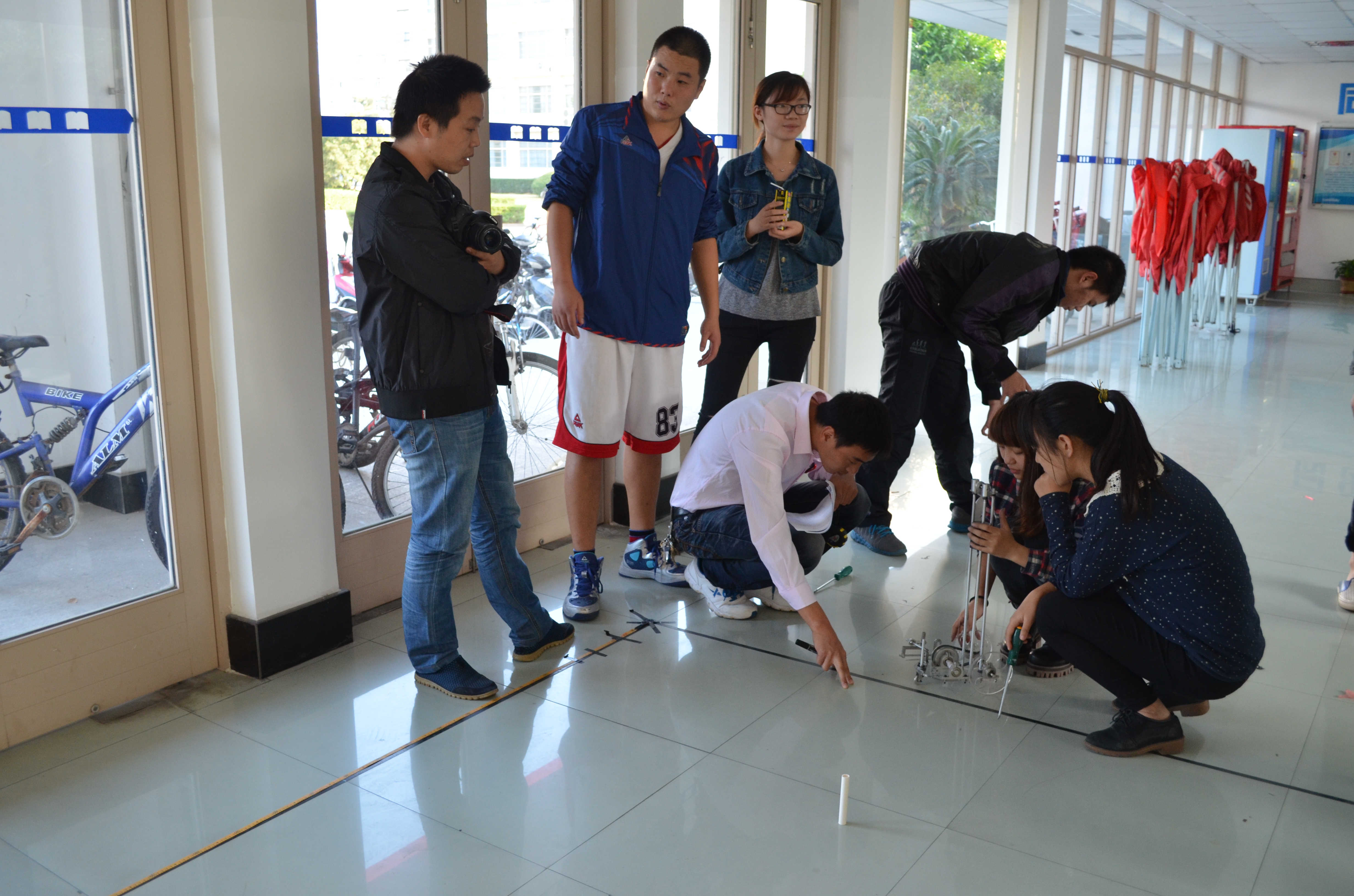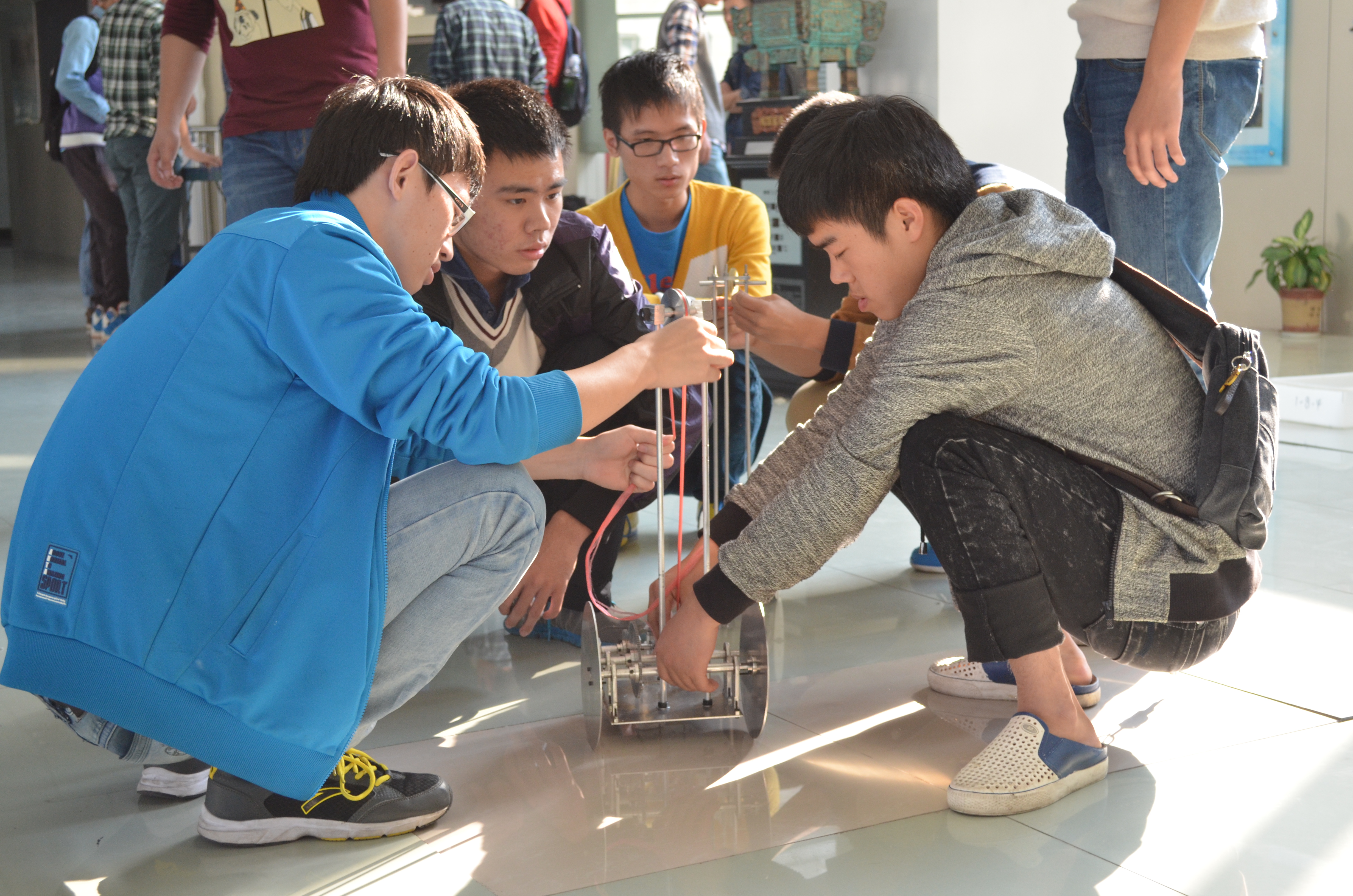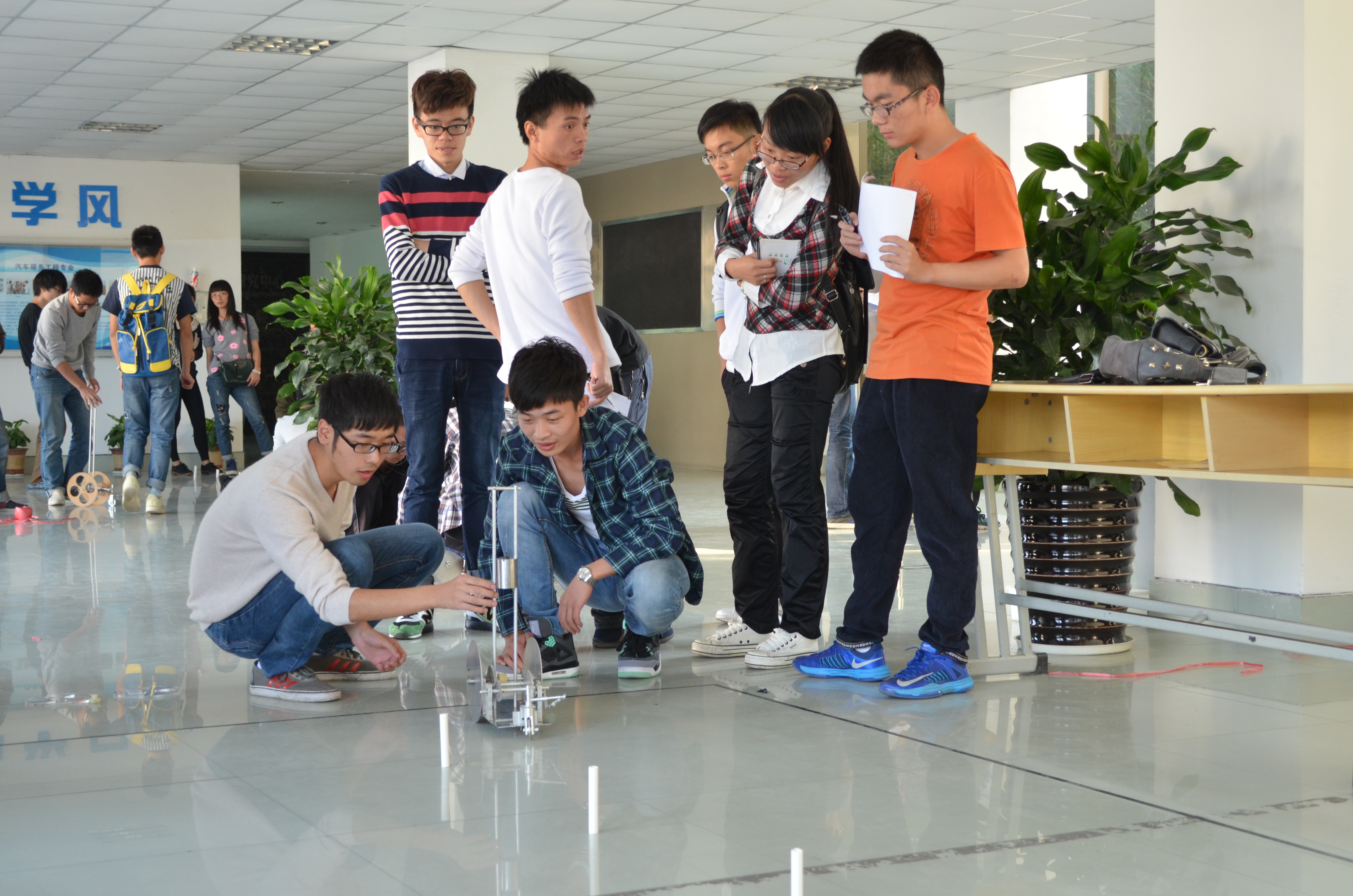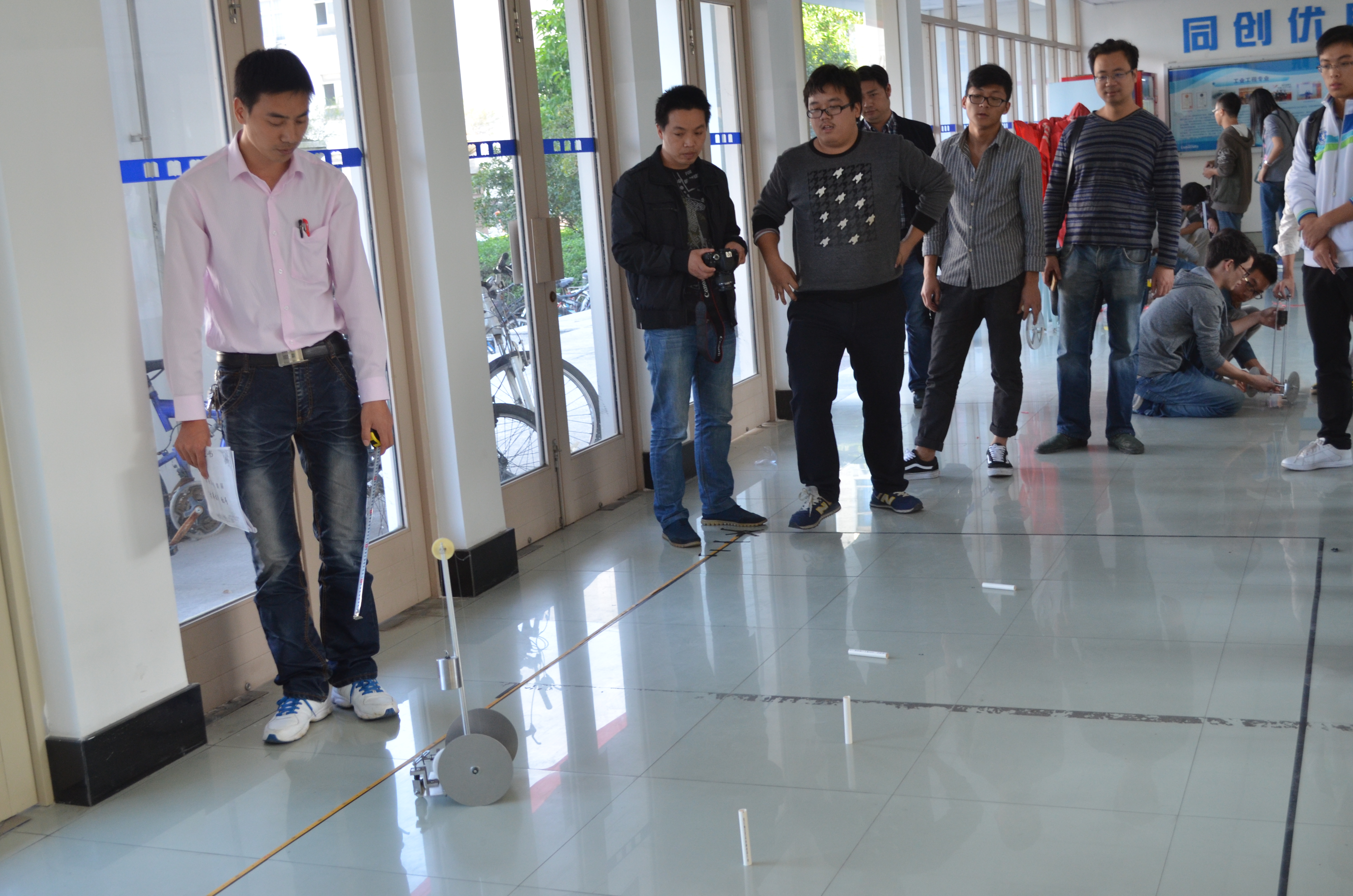 11月5日下午,由黄色网址 大学生科技创新中心举办的科技之光活动月之无碳小车大赛在机电楼大厅火热展开。来自各个小组选手们制作的小车是纯手工打造的无碳绿色作品。本次比赛莅临指导的有李勇、陈益丰、孙兵涛、潘敏辉、陈雷清等几位老师。