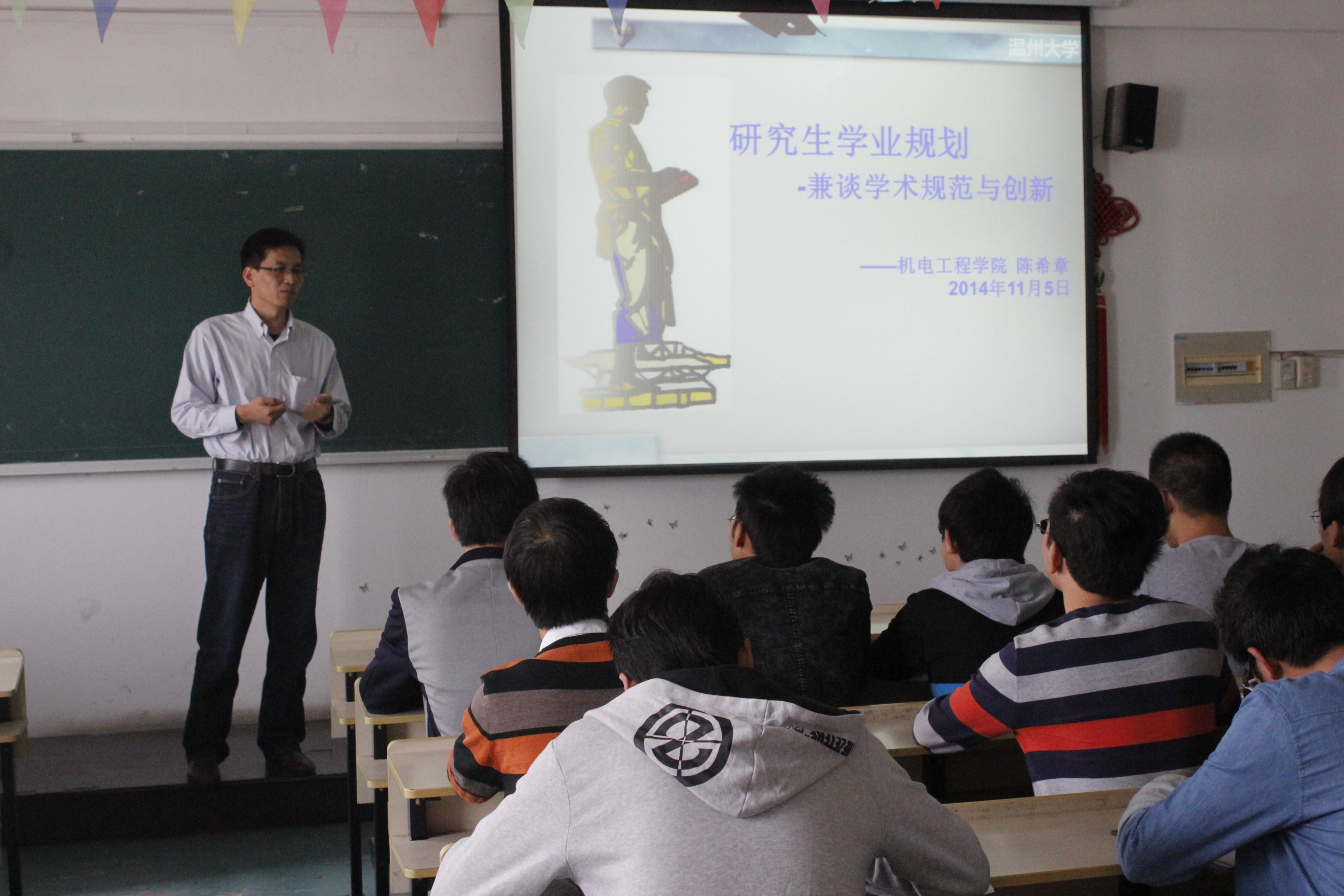 2014年11月7日,黄色网址 组织的以“研究生学业规划——兼谈学术规范与创新”为主题的讲座在6-B510举行。本次讲座特邀中国焊接学会机器人与自动化专委会委员、中国机械工程学会高级会员、美国焊接学会会员、学院硕士生导师陈希章副教授为我院2014级研究生新生“现身说法学术研究”。