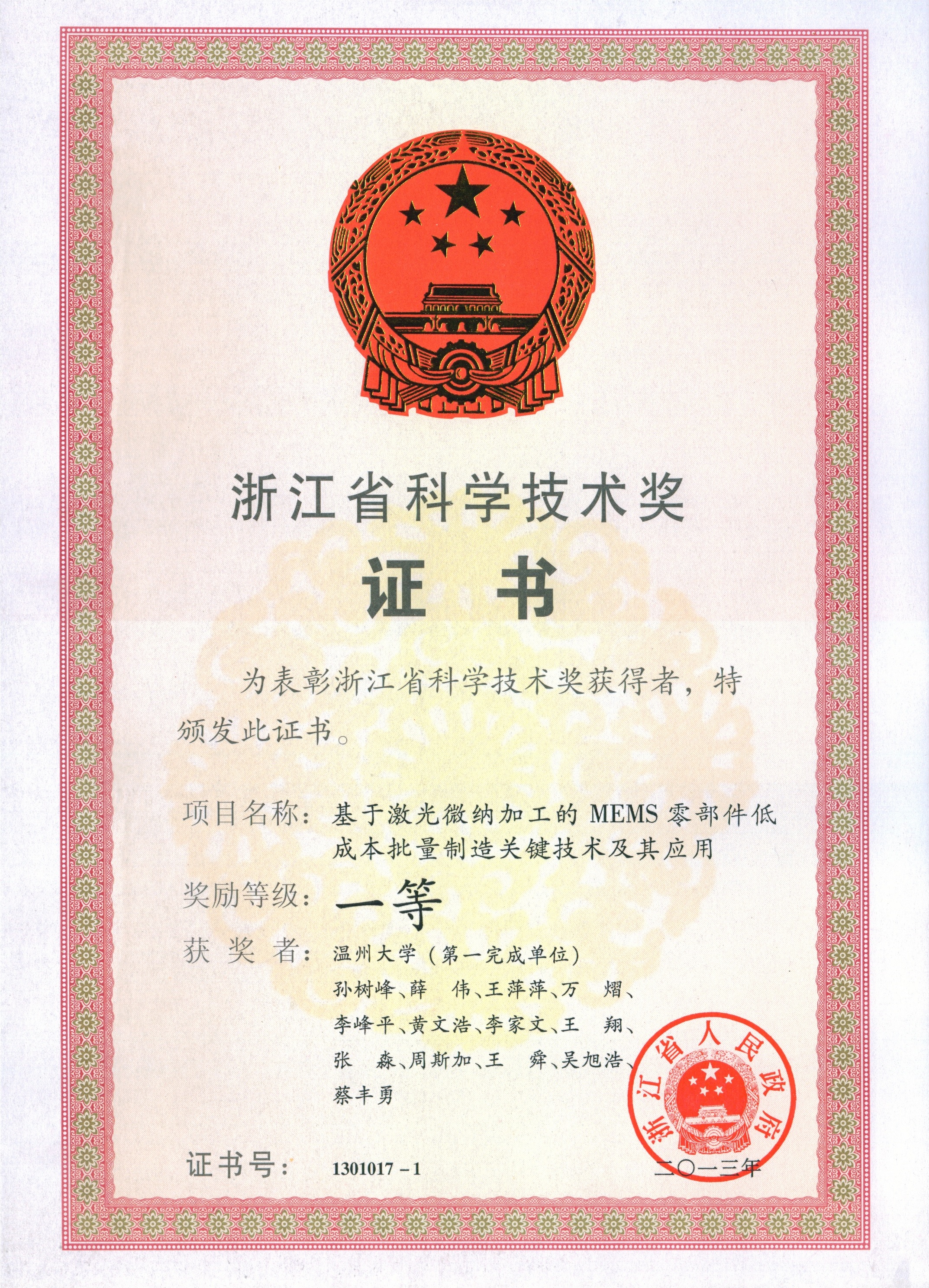 我院孙树峰副教授及其科研团队完成的《基于激光微纳加工的MEMS零部件低成本批量制造关键技术及其应用》成果获得2013年浙江省科学技术奖一等奖。此次省科学技术奖一等奖的获得填补了黄色网址 建院历史以来省科学技术奖一等奖的空白,也是温州大学建校历史上第二次获得省科学技术奖一等奖。对于提升我院学科科研水平,提高我院的学科科研影响力和办学声誉具有巨大的影响。