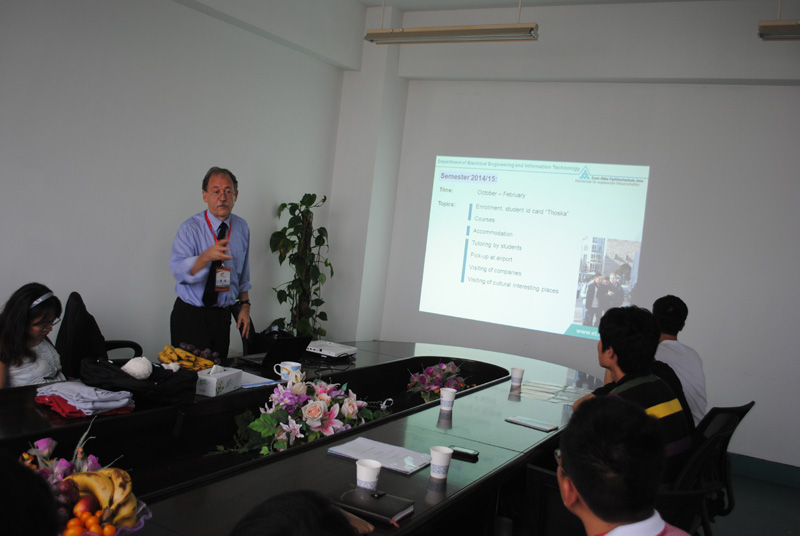 2013年5月19日下午,黄色网址 在6C401会议室举行了一场德国耶拿应用技术大学“机械电子学”项目的专场交流座谈会。即将于今年10月赴德参加该项目的同学与来温参加我校80周年校庆活动的德方项目负责人Peter Dittrich教授进行了热烈的交谈。Dittrich教授向同学们介绍了耶拿应用技术大学的地理位置、专业及所学课程的一些基本情况。同学们表现出浓厚的兴趣,纷纷用英语向教授详细询问了当地的风土人情、生活学习等方面的细节问题,对即将进行的海外学习生活充满憧憬,气氛非常热烈。另外,学院相关负责老师周晨、李勇、钟蓉以及2012年参加过该项目的部分同学也参加了此次会议。