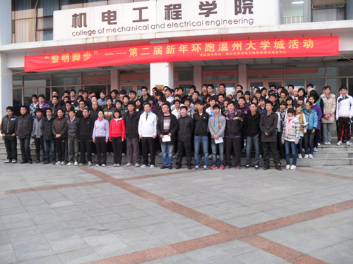 随后,所有的人齐唱《歌唱祖国》,在雄壮嘹亮的歌声中,本次新年第一跑活动正式开始。每个人都怀着激动和兴奋的心情奔跑在高教园区熟悉的道路上。他们从机电学院门口出发,经过南大门、图书馆、商务中心、C区宿舍,路过温州医学院大门、温大北校区大门、温州职业技术学院,最后回到温州大学东大门。所有老师和同学都跑完了全程,并在东大门合影留念。